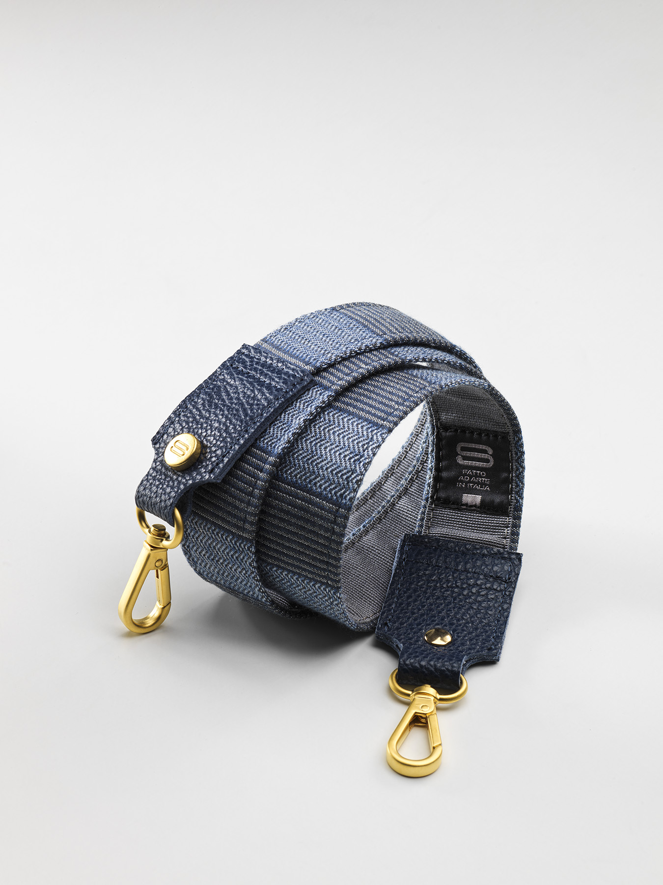 Tracolla in pregiato tessuto da arredo lunga 97 cm inclusi i moschettoni, anch’essi di produzione rigorosamente italiana.